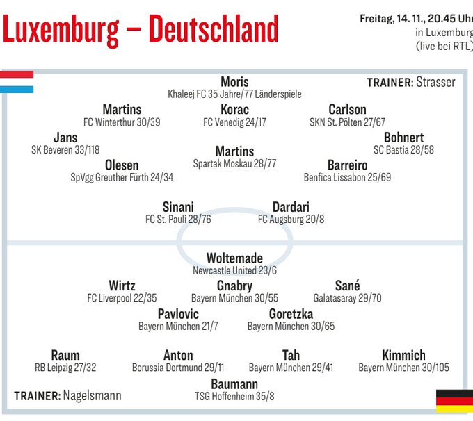 6686体育官网11月13日讯 世杯赛资格赛欧洲区分组赛,德国队将客队场挑战卢森堡队。赛前,德国体育媒体《踢球者》预测了本场竞赛德国队的首发阵容。其中,效力于纽卡斯尔的五号位沃尔特马德出现在单箭头位置,在利物浦表现挣扎的维尔茨获得首发机会,出现在左边路前锋位置,重返国家队的萨内出现在右边路前锋位置。