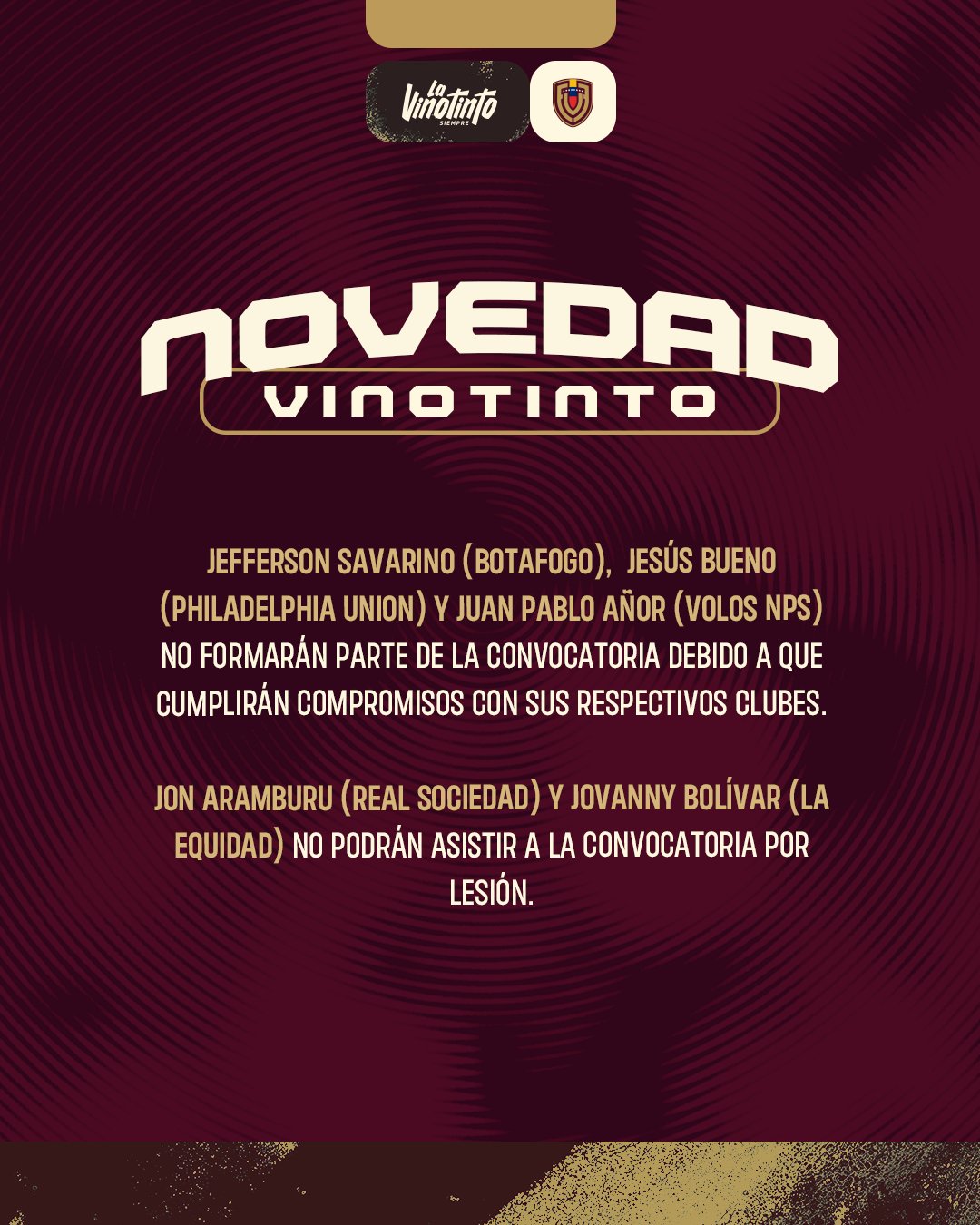 6686体育官网11月13日讯 委内瑞拉国家队官方宣布,博塔弗戈的萨瓦里诺、沃洛斯的阿诺和费城联合的布埃诺因俱乐部赛会无法报到,无缘出战与澳大利亚的竞赛。