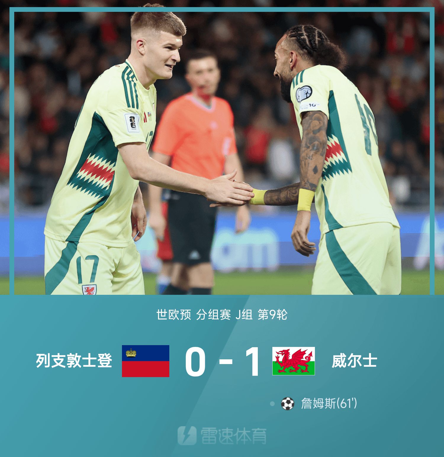 6686体育官网11月16日讯 26赛季世欧预分组赛J组第9轮,列支敦士登坐镇主队场迎战威尔士。上半场,布罗德黑德破门,裁判员介入视频裁判判定进球无效。下半场,第61分钟,詹姆斯破门打进全场唯一进球锁定战局。最终,威尔士1-0险胜列支敦士登,威尔士分组赛有望晋级世杯赛名额。