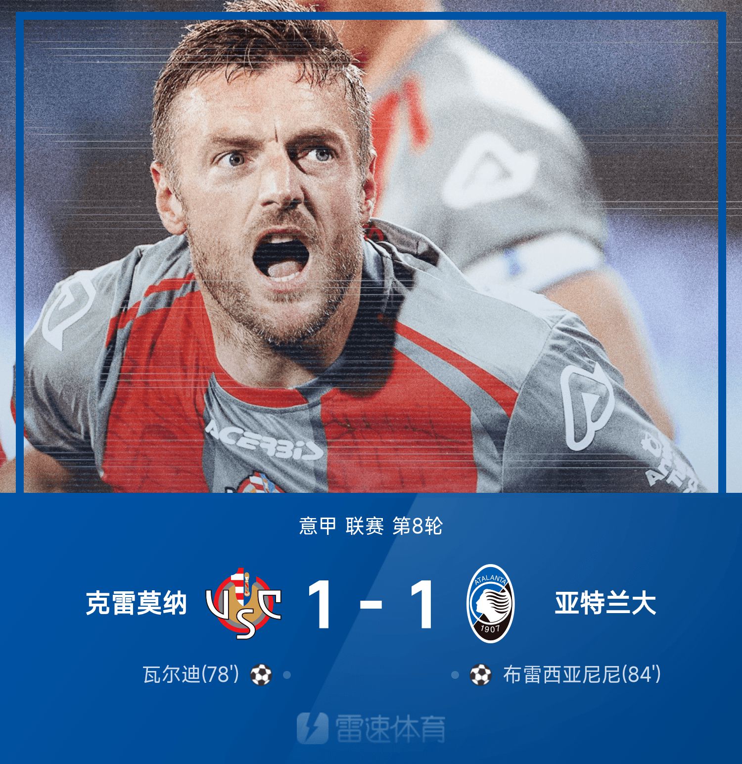 意甲战报:瓦尔迪收获意甲首球,克雷莫纳1-1亚特兰大