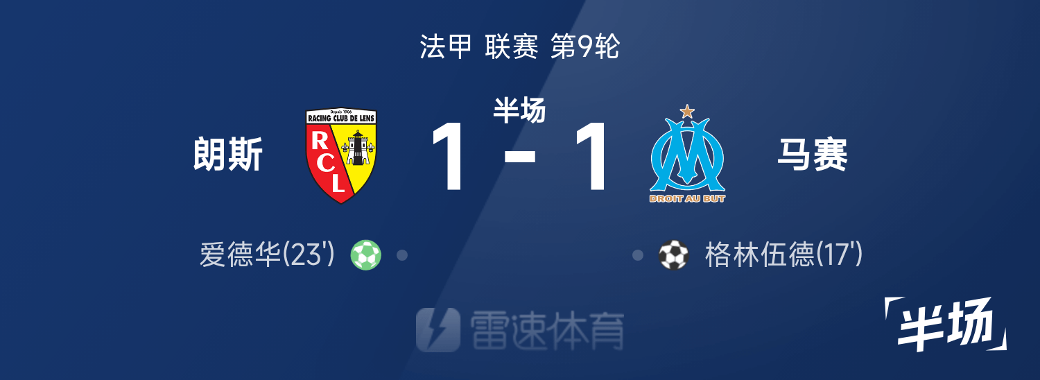 法甲半场:格林伍德破门,爱德华点射扳平,马赛1-1朗斯
