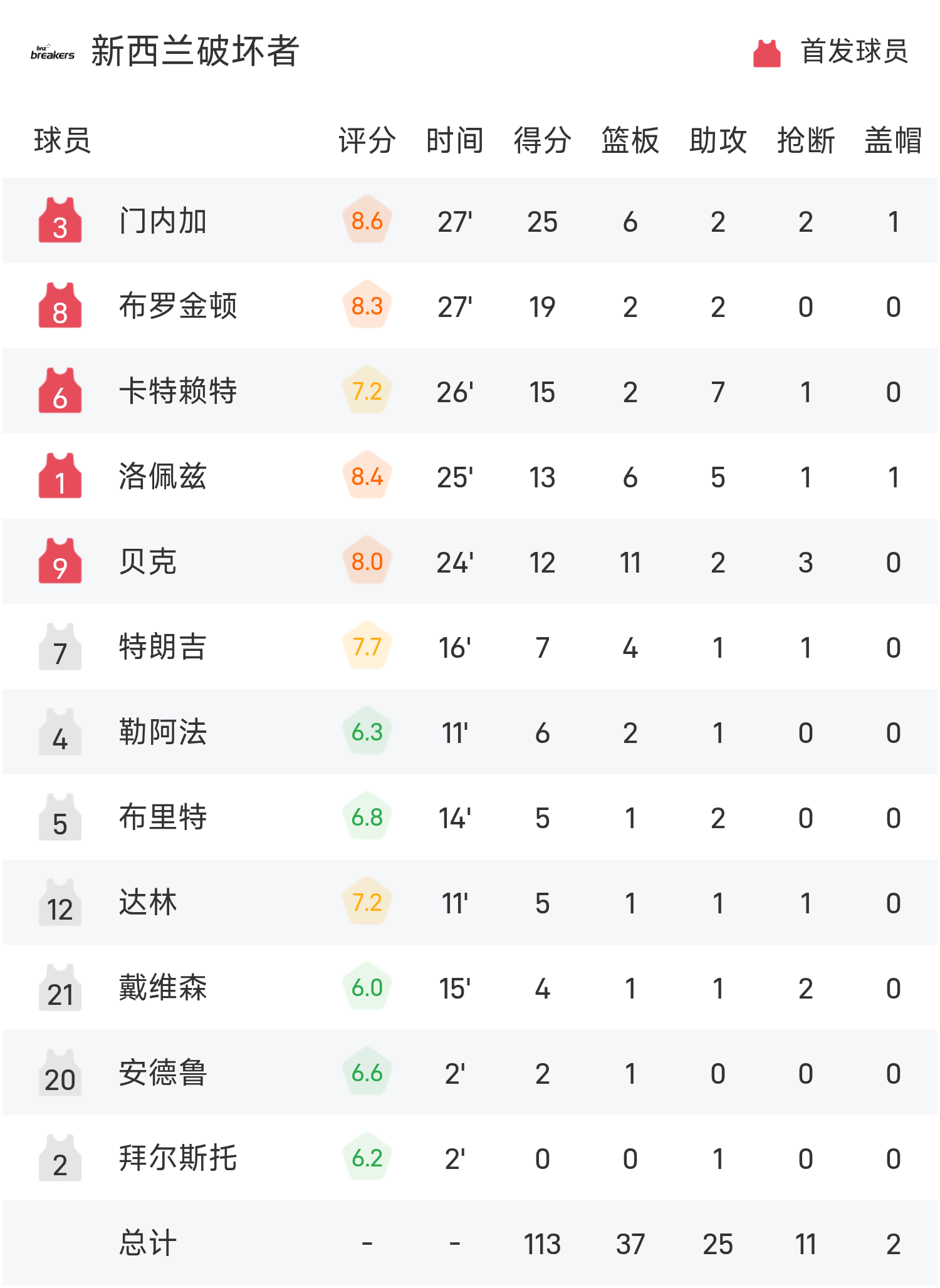 双方全场战罢,布里斯班子弹84-113不敌新西兰毁坏者。