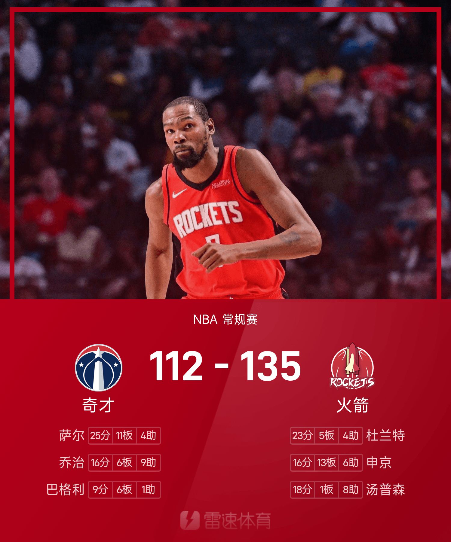 NBA战报:杜兰特23分,火箭135-112大胜奇才