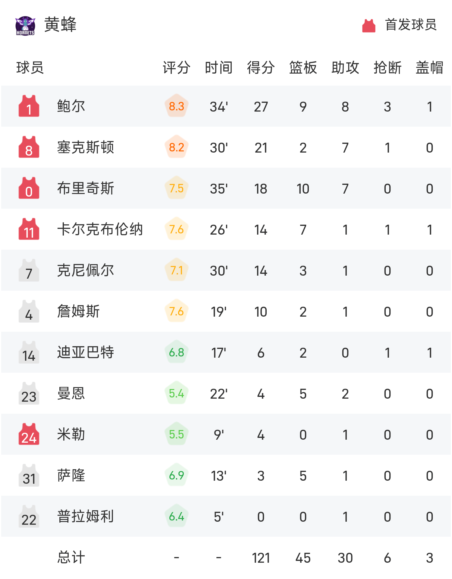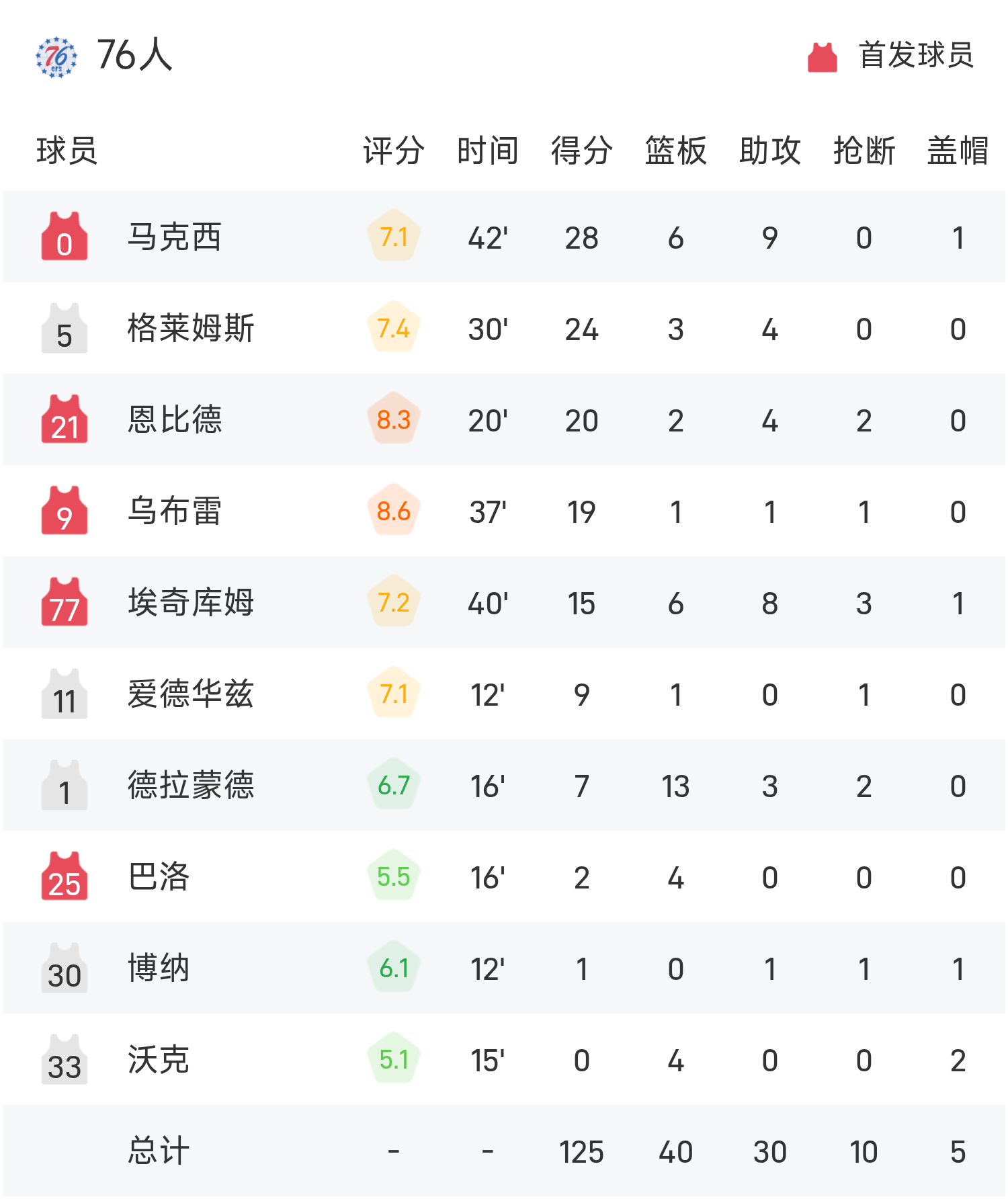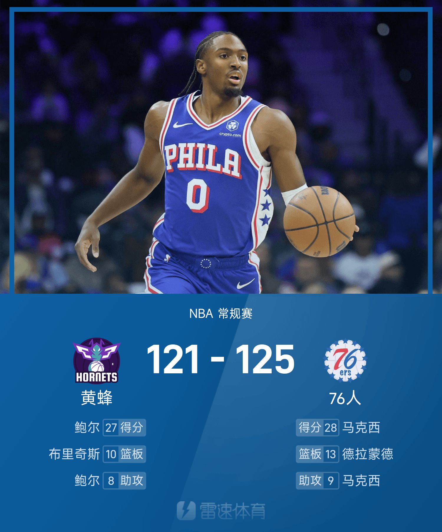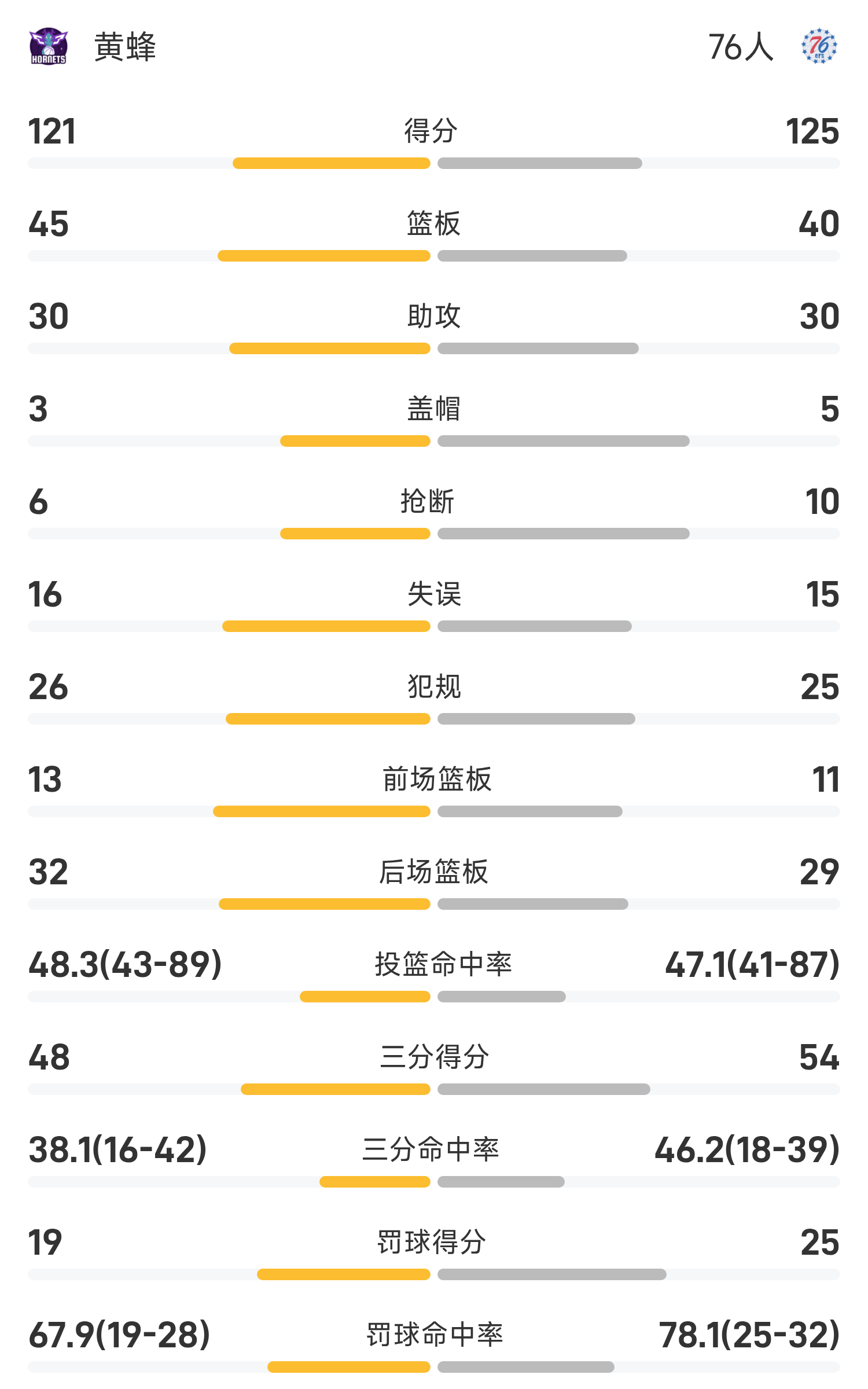 双方全场战罢,76人125-121战胜黄蜂。