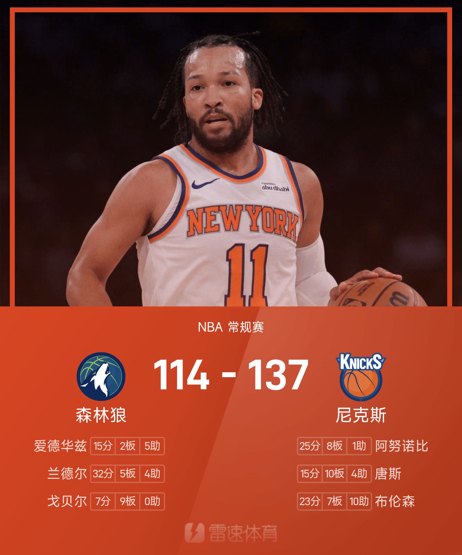布伦森23分7抢篮板10助攻,兰德尔32分难救主。